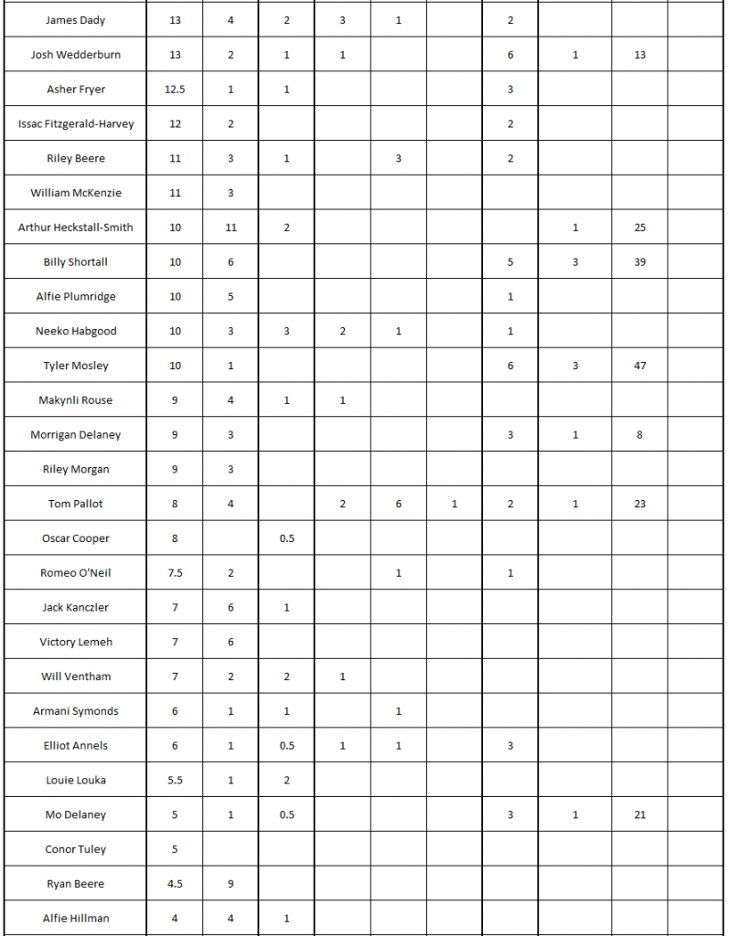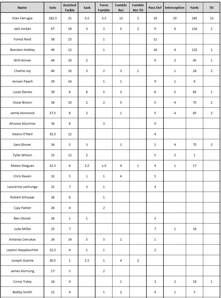 Under 16 & 19 – All Time DEFENCE Posted on 16/10/2025 by Neil Loveless DEFENSIVE STATS Sorted by Solo Tackles BACK TO STATS HOME