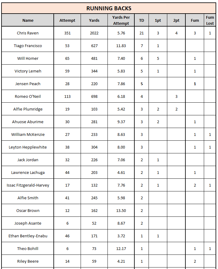 Under 16 & 19 – All Time RECEIVINGUnder 16 & 19 – All Time DEFENCE