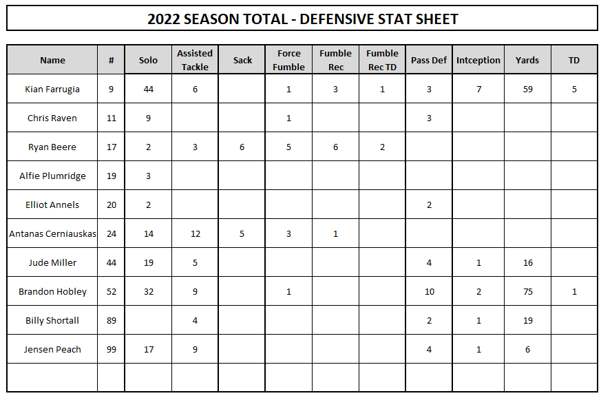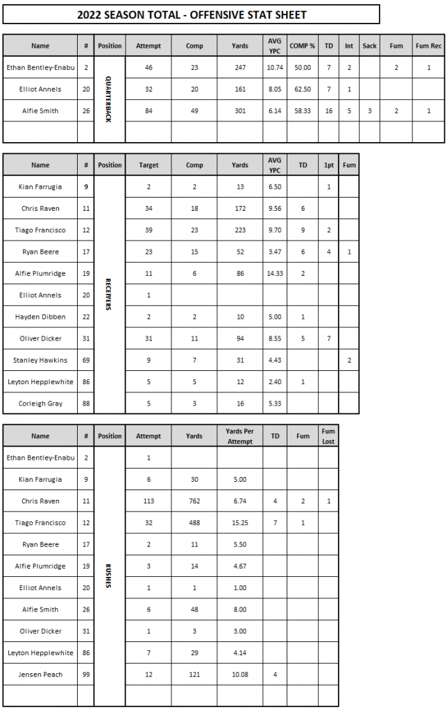 Under 16 – 2022 Stats Posted on 02/08/2025 (02/08/2025) by Neil Loveless OFFENCE DEFENCE BACK TO STATS HOME