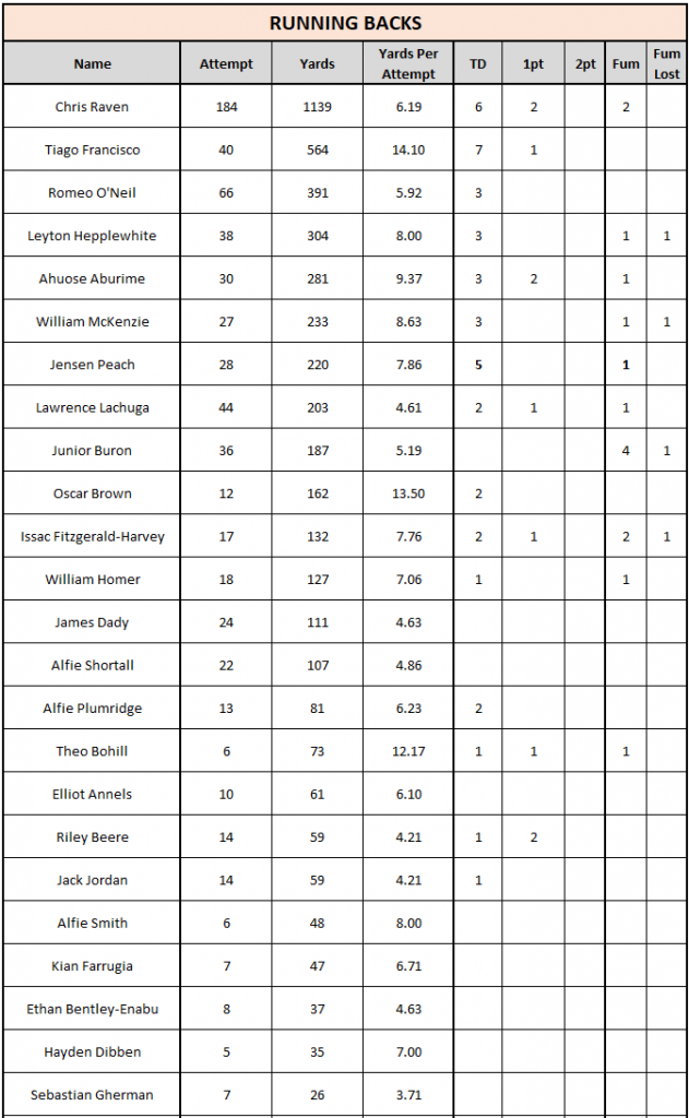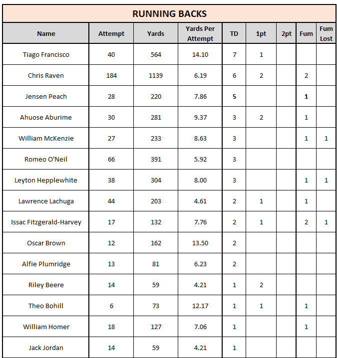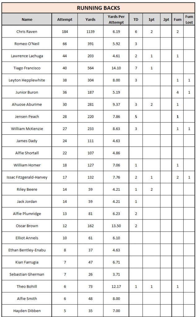 Under 16 – All Time RUSHING Posted on 20/08/2025 (20/08/2025) by Neil Loveless OFFENSIVE RUSHING STATS TOP 25 (where 25 exist) MOST YARDS MOST TOUCHDOWNS MOST CARRIES BACK TO STATS HOME